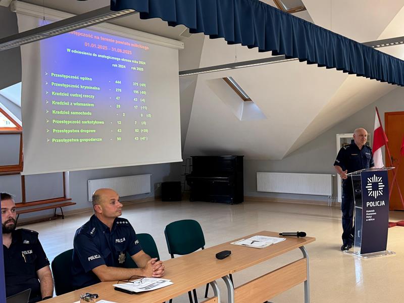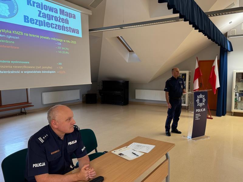 Debata składała się z paneli tematycznych, wśród których znalazła się tematyka dot. działań Komendy Powiatowej Policji w Miliczu na rzecz bezpieczeństwa mieszkańców powiatu milickiego, realizowanych przez milickich policjantów programów prewencyjnych oraz prezentacja danych dotyczących ilości zdarzeń zaistniałych przez pierwsze osiem miesięcy 2025 roku na terenie powiatu milickiego. Informacje przekazane przez Komendanta Powiatowego Policji w Miliczu insp. Mariusza Tańskiego potwierdziły, że powiat milicki należy do jednych z najbezpieczniejszych powiatów w województwie dolnośląskim. Ponadto Pan Komendant przypomniał zebranym o stale funkcjonującej już od 2016 roku aplikacji pn. „Krajowa Mapa Zagrożeń Bezpieczeństwa”, natomiast Kierownik Rewiru Dzielnicowych asp. szt. Andrzej Pytlak ponownie wytłumaczył zebranym zasady działania tego narzędzia informatycznego, zachęcając uczestników debaty do korzystania z możliwości zgłaszania policjantom wszelkich problemów za pomocą tej aplikacji.